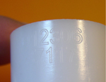 To create the 13-character text string shown in the photograph, a Synrad sealed CO2 laser was used with an FH Series marking head driven by Synrad’s WinMark Pro laser marking software. The FH head was equipped with a 125 mm lens that provides a 180-micron (0.007”) focused spot with a 3 mm (0.118”) depth of focus spanning a maximum mark area of 85 mm × 105 mm (3.4” × 4.2”).