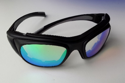 Image: Brinell Vision custom designed prescription eyewear for blocking green and NIR lasers. The base6 curved lens substrates are coated with over 100 individual dielectric thin films to provide maximum visible transmission and high levels of blocking for green (532nm) and NIR (1064 & 2100nm).