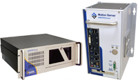 The Automation Motion Server is available in panel-mount and rack-mount versions. The panel-mount version is designed for integration into a control cabinet. The slotted “key-hole” mounting pattern makes for easy insertion and removal from the cabinet, and a liquid cooled heat-sink and solid-state disk-drive ensure reliable operation up to 50°C. The rack-mounted version is available in 1U and 4U heights with rear-accessible internal PCI expansion capability.