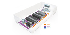The M LINE FACTORY PRD, includes three separate, independent modules for the powder supply, the part structure and the powder overflow. The modules are moved back and forth within the M LINE FACTORY PRD and the processing unit, the M LINE FACTORY PRD, using a tunnel system. The intention is that in the future the storage of powder or even downstream workstations should also be incorporated in an automated fashion. Such an integrated production scenario, which Concept Laser is presenting with the “AM Factory of Tomorrow,” consistently implements the vision of “Industry 4.0” in respect of the demand for automation.