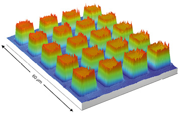 " The 2D cross-grating was realised in chitosan, a biocompatible, using an Argon Fluoride excimer laser. This figure shows small parts of the grating, 5mm × 5mm, measured with a white light interferometer (WLI) WYKO NT 1100. The structure was produced by mask projection and translating the sample in orthogonal directions relative to the stationary 193 nm laser beam. Laser ablation was carried out using a laser fluence of 110 mJcm-2, a pulse repetition frequency of 10 Hz and a motion control stage (Aerotech Fiber Align) velocity of 0.1 mms-1. The column-like structures are 7 microns square and 525 nm high."