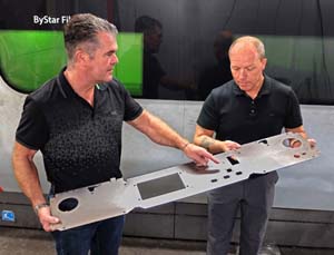 Figure caption: Paul Short (left) and Steve McMillan, joint owners of ESP Laser Cutting, inspecting a control panel part that has been laser cut from 1.5 mm mild steel sheet on their new 12 kW ByStar Fiber 3015, the first to be installed in the UK.