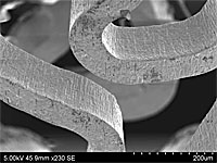 | Close up of a coronary stent, as cut, showing smooth cut sides and negligible hear affected zone. A scale is included lower right. (Courtesy Swiss Tec) |