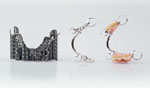 Image: Production stages for additively manufactured removable partial dentures. Left to right: dental prosthesis with support structures after AM; with support structures removed; and after completion.