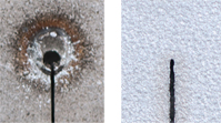 Laserdyne’s exclusive SmartPierce feature on all of its new multi-axis laser systems creates a clean pierce point that is the same diameter as the cut width (right). Note the entry point diameter is controlled so that it is the same as the width of the cut. The area around the pierce point is also clean with no debris. By comparison, standard piercing (left) produces a starting hole that is significantly larger than the cut width with significant debris surrounding the start point. Both examples show piercing operations on 10.5 mm (.041 inch) thick Haynes® 617 material.