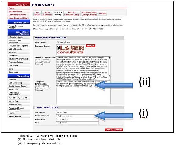 6. Companies offering laser job shop services: in the same way as step (3), click on the ‘Job Shop and Laser Cutting Capability’ tab and add/edit your entries here. These details are automatically added to the ‘Job Shop Laser Cutting Capability’ database that visitors to the site can search.