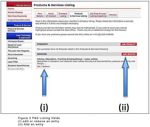 5. In the same way as steps (3) and (4), click on the ‘Products & Services Listing’ tab, see figure 3. Here you can add and/or edit your entries in the various product and service categories, using the pull down menus, all of which is self-explanatory. Click the SAVE button in the lower right corner before exiting.